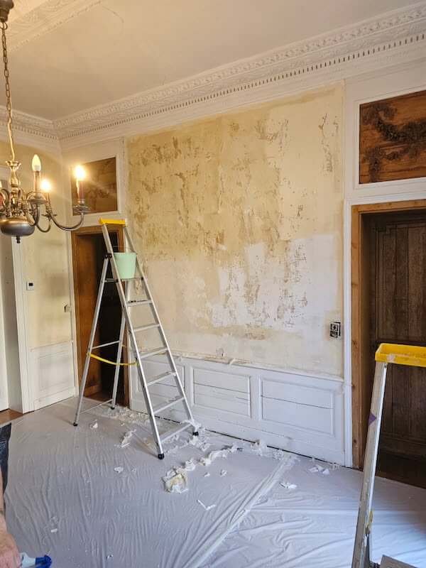 Rebouchage suivi de la pose d’un calicot et d’une toile de verre intissée pour renforcer les surfaces.