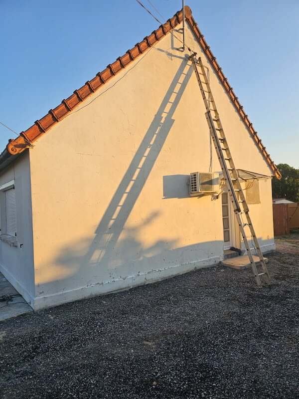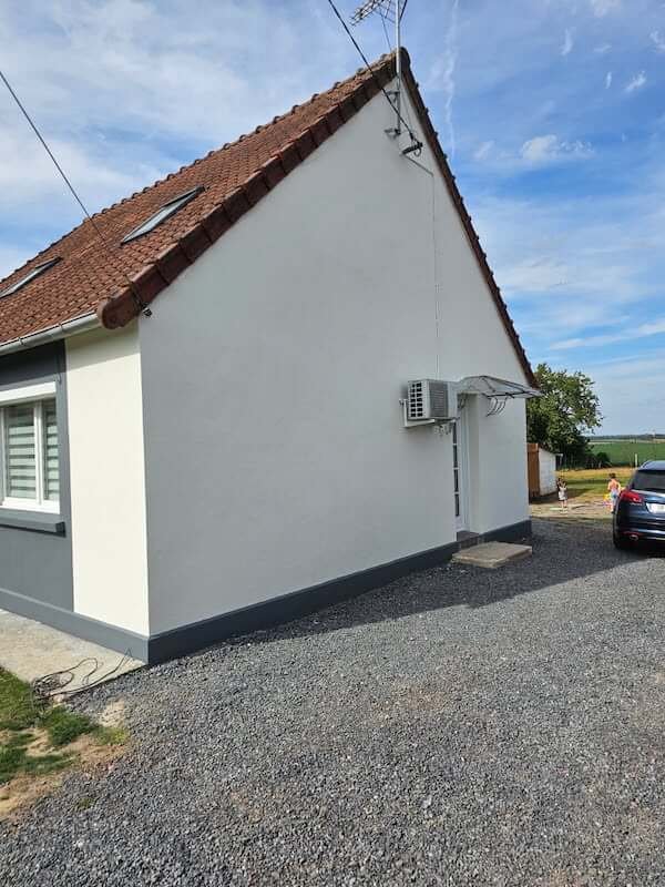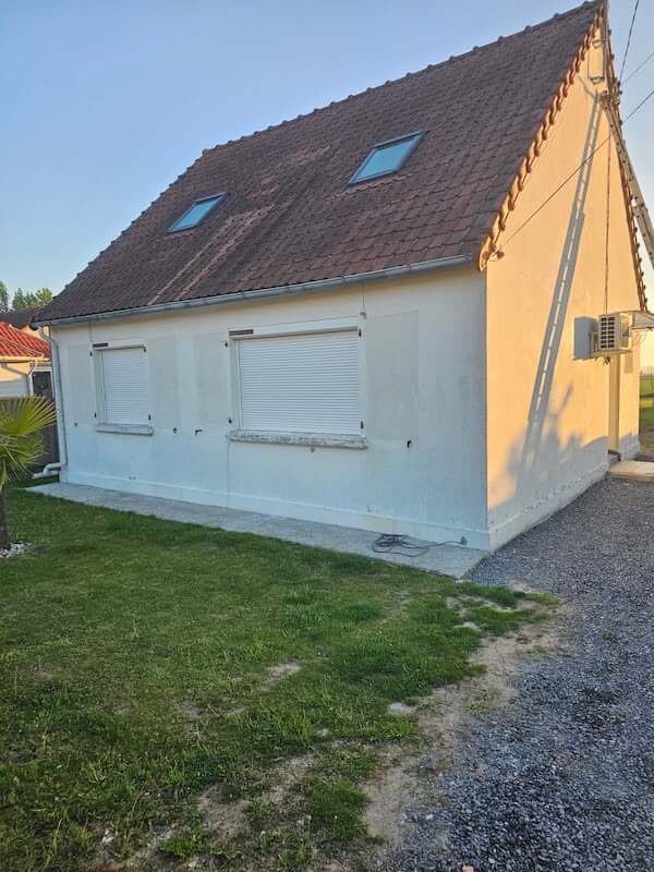 Nettoyage de façade haute pression, traitement des fissures, application de deux couches d’anti-mousse et de peinture blanche, ainsi que rénovation des volets.